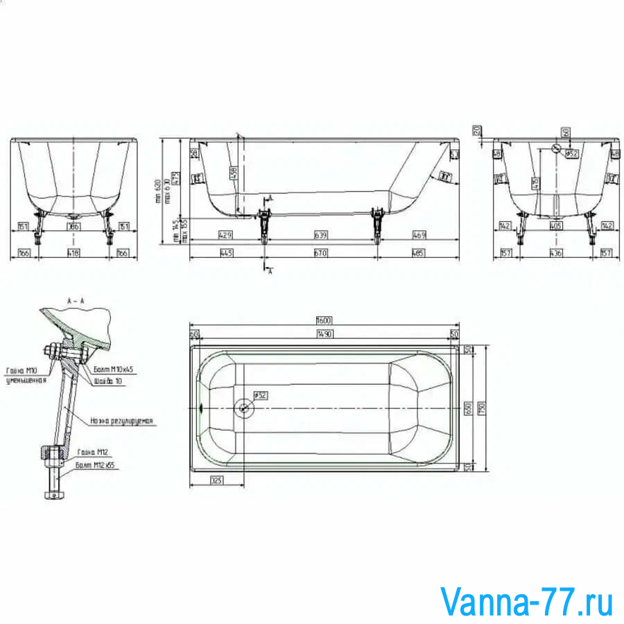 Ванна имеет прямоугольную форму и размеры 160 см в длину и 75 см в ширину, что делает ее удобной и просторной для одного человека. Глубина ванны составляет 46 см, что обеспечивает комфортное размещение.